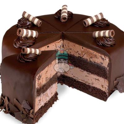 Layer of devil's food cake, chocolate ice cream with chocolate shavings, wrapped in fudge ganache.