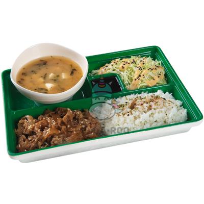 Bento box that comes with stir-fried beef slices served with steamed rice, miso soup and yasai itame.