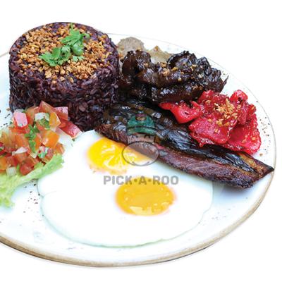 Tapa, Tocino, Smoked Bangus Belly, Longganisa, Garlic Fried Black Rice, Two Sunny-Side Up Eggs, Tomato Salsa