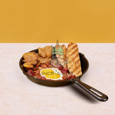 Delightful skillet with two eggs, chunks of Schublig, sweet ham & bacon, smashed potatoes and ciabatta sticks.