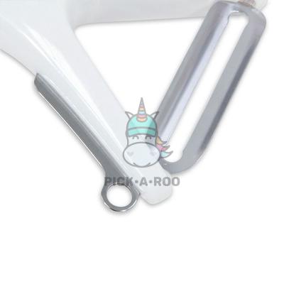 • This peeler features acid etched stainless steel blades that effectively cut peeling time in half. Overall comfort has been addressed via an ergonomic handle that enhances performance while reducing hand fatigue.