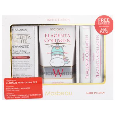 The Mosbeau Ultimate Whitening Set combines Mosbeau's best whitening supplements to bring out your desired fairness in just a few weeks! Benefits: -Transforms the overall skin condition with Placental Protein and 10 Active ingredients that promote whitening ; anti-aging ; and skin cell renewal. -Helps the skin radiate a fresh glow by working from the inside out. Advanced whitening and anti-aging while helping you boost your immunity with Mosbeau Placenta White Advanced Food Supplement.
