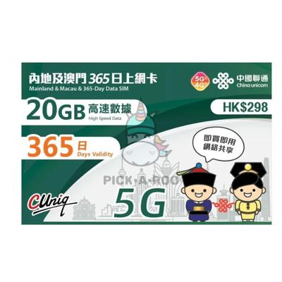 Travel Sim Mainland China & Macau 365 Days Data SIM 20GB High Speed 5G