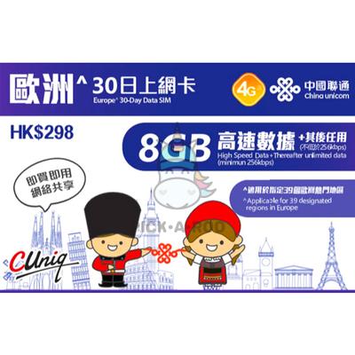 Travel Sim Europe 30 Day Data SIM 8GB High Speed Data + Therafter Unlimited Data