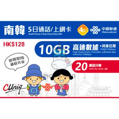 Travel Sim South Korea 5 Day Voice/Data SIM 10GB High Speed Data + Therafter Unlimited Data + 20 Mins Call