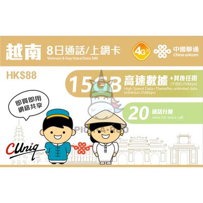 Travel Sim Vietnam 8 Day Voice/Data SIM 15GB High Speed Data + Therafter Unlimited Data + 20 Mins Call